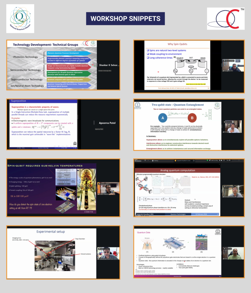 • The workshop delivered a comprehensive journey spanning quantum theory, algorithmic foundations, superconducting circuits, trapped-ion systems, photonic platforms, semiconductor spin qubits, cryo-electronics, neutral atom architectures, and fault-tolerant design strategies.